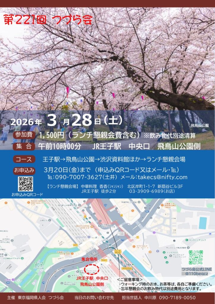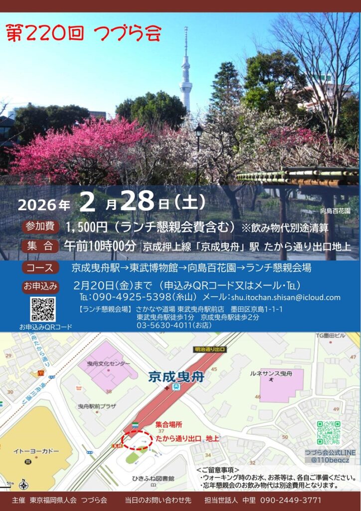 | お問合せ | 代表世話人 土井 takecs@nifty.com 090-7007-3627 つづら会 担当世話人 糸山 090-4925-5398 つづら会公式LINE @110beqcz ※まだ県人会の会員でない方は、この機会にご入会いただきますよう、お願いいたします。 |