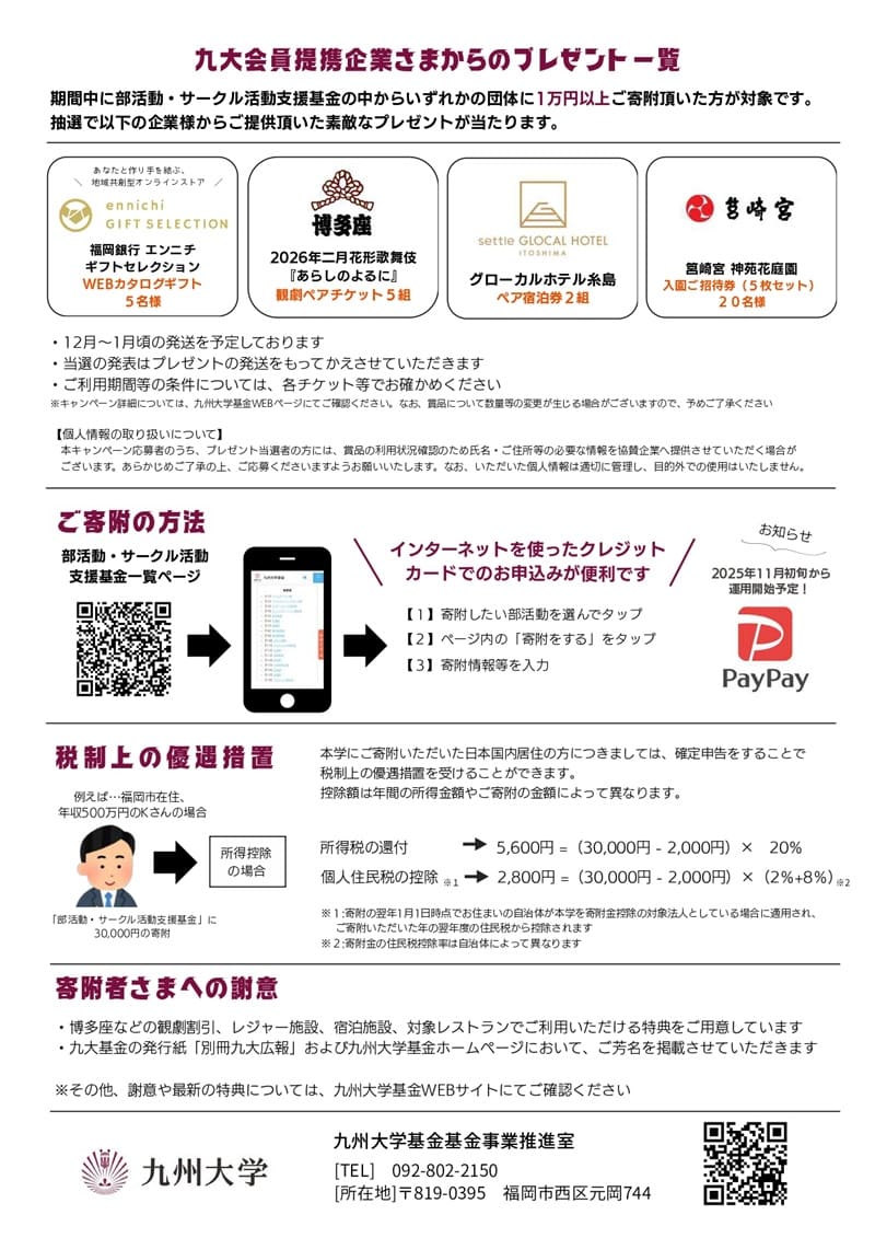 対象期間中(2025年9月1日~11月30日)、九州大学基金に1万円以上のご寄附をいただいた方を対象に、抽選で素敵なプレゼントが当たります!